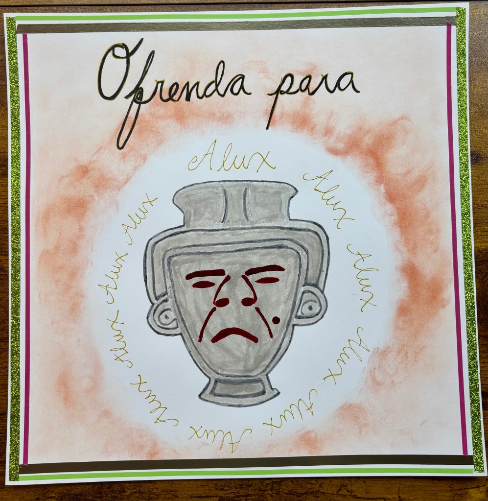 Otro componente de mi herida de invisibilidad/rechazo me sorprendió muchísimo. En meditación, me encontré con una especie de demonio travieso que forma parte de mí y que estaba atrapado en una jaula de cristal. Esta parte de mí es juguetona, tonta y traviesa. Pero al seguir observándola, se convirtió en un espíritu muy antiguo, un guardián que usa sus trucos para ocultar cosas en la naturaleza y protegerlas del daño. Busqué en Google los rasgos que vi en su rostro y descubrí que en una cultura centroamericana, que de hecho forma parte de mi ADN actual, existen criaturas llamadas alux que son guardianes del bosque. Eso es. Y tenía mucho sentido, ya que he estado obsesionade con los elfos durante años, que son la misma vibración, elementales de la tierra. Me dio mucha pena haber atrapado a mi alux interior y le pedí perdón. En cierto modo, yo era su bosque, y él me escondía como protección, sí, pero también como venganza por haberlo atrapado así. Abrí la jaula y nos abrazamos. Le dije que se fuera donde quisiera dentro de mí, o afuera, eres libre, le dije. Mi pequeño guardián travieso saltó dentro de mí, queriendo mantener vivo mi descaro, mi sentido del humor. Una parte de él también regresó al bosque. Le prometí hacer ofrendas para reparar mis acciones. He hecho dos obras de arte visual como ofrendas para él y haré más.