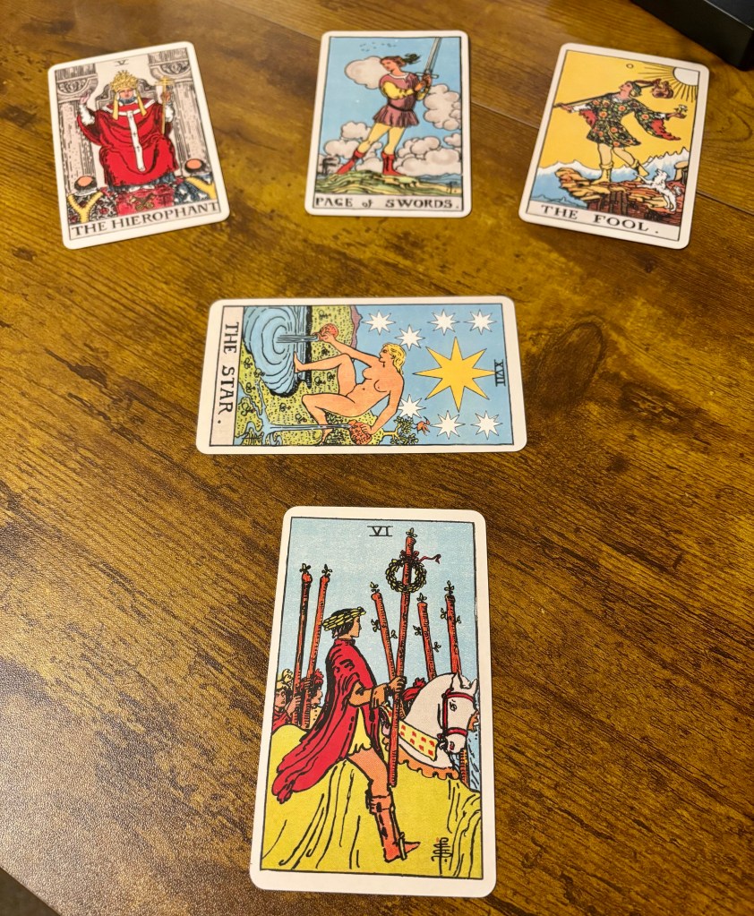 La tirada cartas que te voy a enseñar, de hecho, sirve para cualquier problema. Me gusta mucho y es muy útil, la escuché en el podcast 3 Pagans and a Cat y desde entonces la he usado con éxito en mi práctica. Cómo siempre, le preguntas a las cartas sobre tu asunto, si quieres, primero explicándole tu situación. Por ejemplo, en mi caso, le explico al tarot que tengo sentimientos muy fuertes por esta persona que acabo de conocer, pero que no me corresponde aparentemente y de hecho por cosas prácticas es un amor casi imposible y controversial. No sé de dónde vienen estos sentimientos porque la persona es, digamos, bastante fuera de lo que me ha gustado antes, y quiero tener más claridad sobre mi relación con ella y por qué me está pasando todo esto ahora.