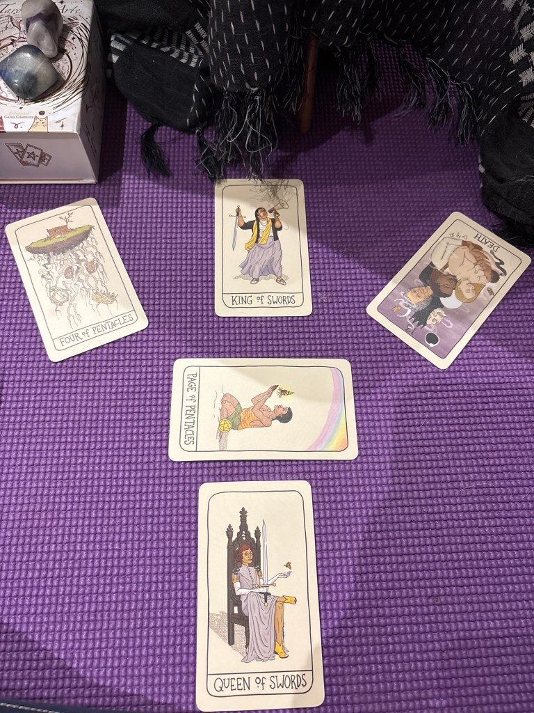 La carta de clarificación fue el Rey de Espadas. Una carta hermosa que simboliza mi deseo de defender la verdad, ser diplomáticx si es necesario, o agitadorx. Representa la línea 5 de mi perfil de Diseño Humano (el Hereje), que busca comunicar la verdad al colectivo, y también mi puerta de los valores. Así que la razón por la que el Paje de Oros cava en la tierra y estudia las raíces es para finalmente comunicar la verdad y defenderla.